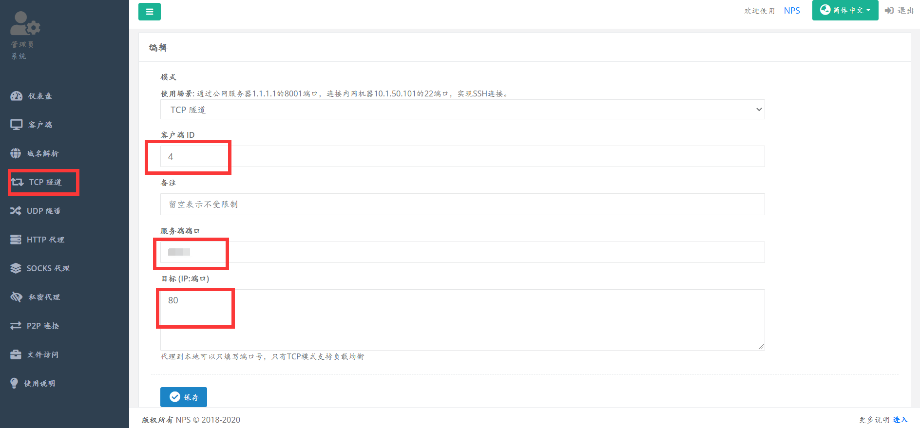 选择tcp隧道,新建一个,填入客户端ID,服务端端口自行设置,不过记得在服务器的防火墙中放行,目标IP只要填入端口号80就可以了
