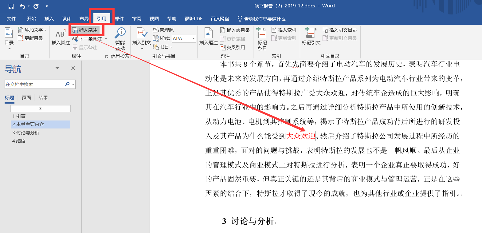 找到要插入引用的位置,如图中红色字体处,将光标移动到那里,找到引用-插入尾注,这时候就可以在这里插入引用了,并且会在文档末尾添加对应序号,