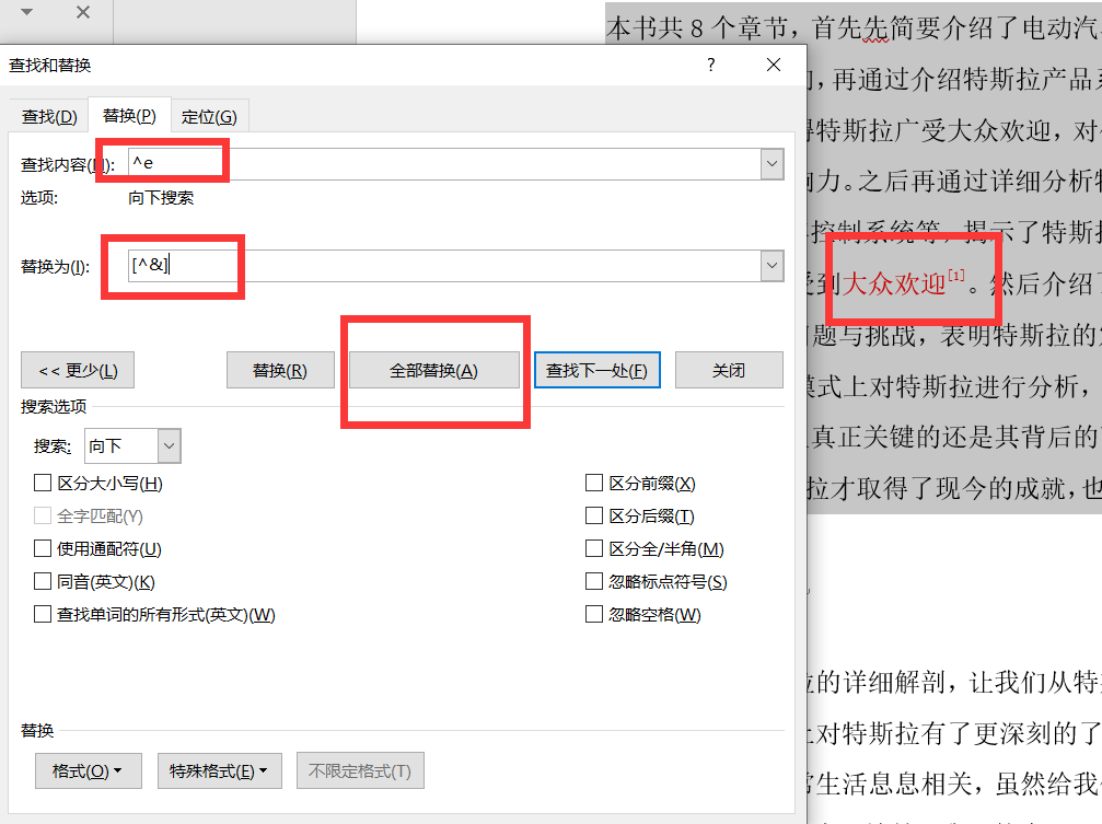 选中要添加中括号的内容,按ctrl 和H键,打开搜索替换界面,然后搜索^e,替换为[^&],全部替换,就可以自动添加上中括号了