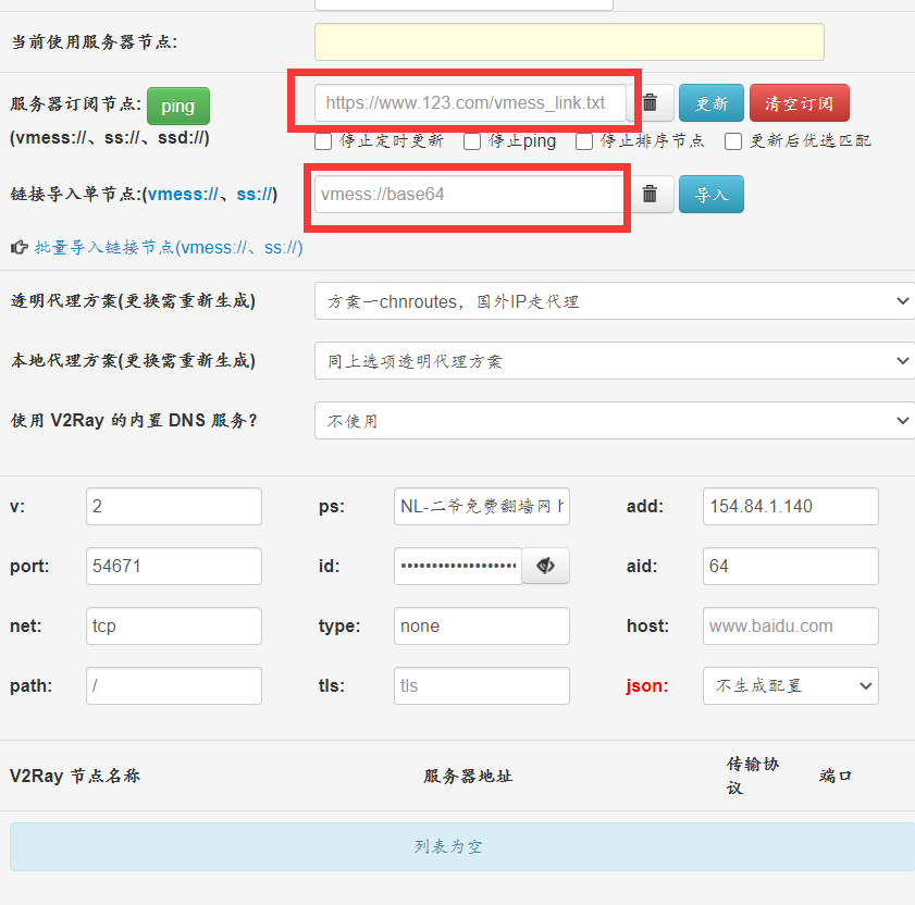 然后在下面输入订阅节点信息或者导出的Vmess信息