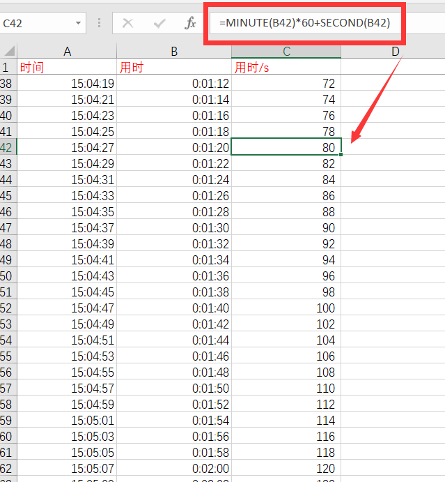 结果如图所示,使用图中公式就可以将时间全部转换为秒为单位,如果有小时,还需要加上hour公式对小时数进行转换