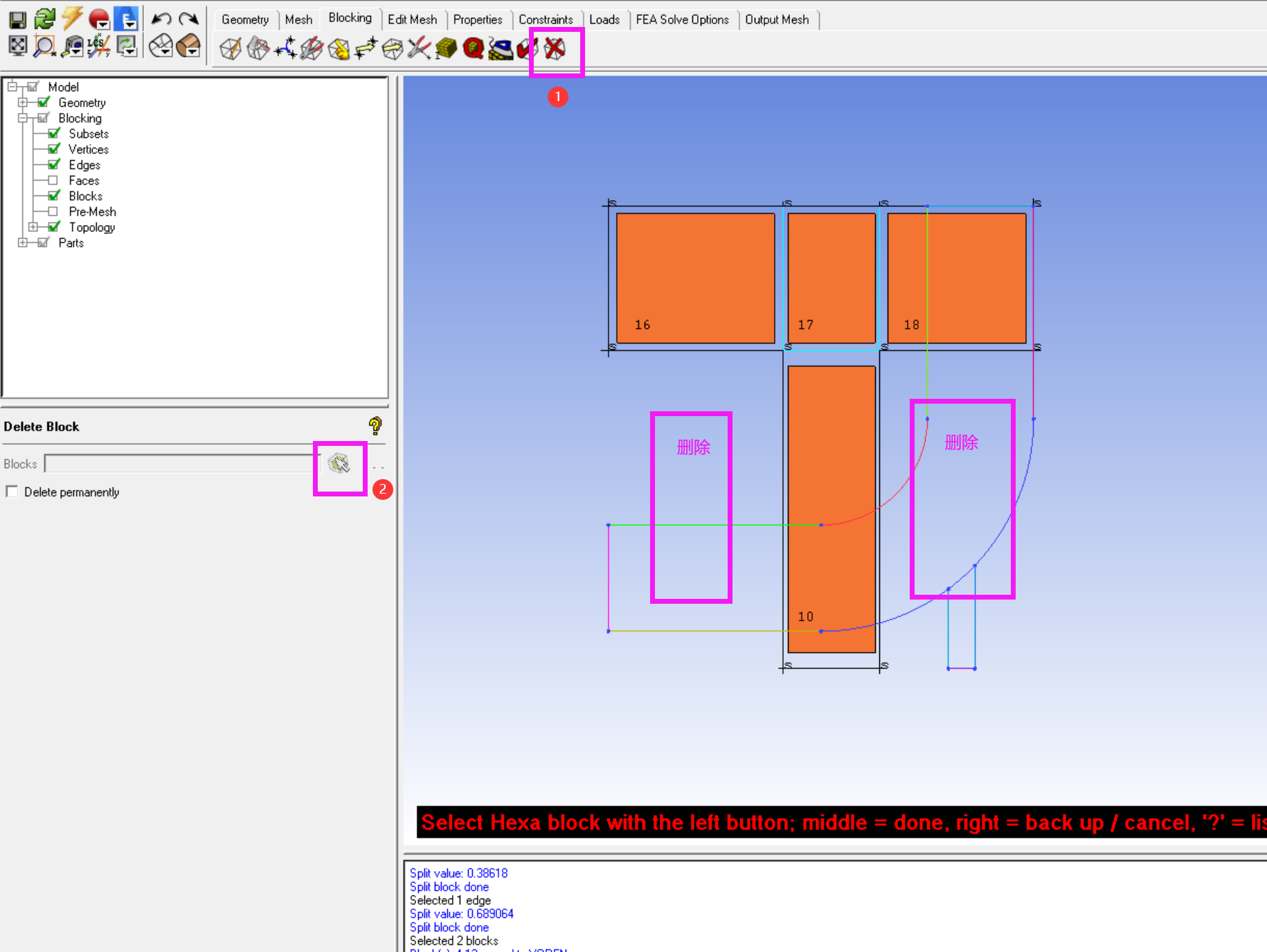此时完成块的初步生成,观察几何模型可以发现,此模型形状近似于T型变形,所以需对生成的块进行切割成T型结构